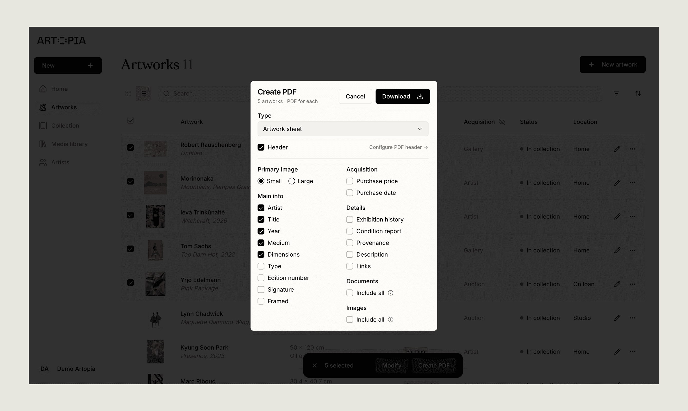 When you click "Create PDF" on an artwork detail page, a dropdown appears with five presets. Each one pre-selects a relevant set of fields for a specific purpose, but you can adjust the selection before creating.